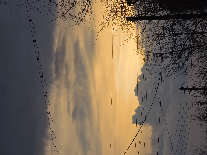 The scene depicts an urban outdoor environment in Lom, Bulgaria, at either sunrise or sunset. The sky, occupying the upper two-thirds of the image, transitions from dark grey-blue at the top to a distinct orange and yellow band at the horizon, with scattered grey and white clouds present. Multiple black utility wires traverse the sky; the uppermost wire displays six small, dark, evenly spaced attachments. Additional wires are visible lower in the frame, running horizontally and diagonally. The lower third of the image, extending upwards on the right side, is occupied by the dark silhouettes of leafless deciduous trees and dense brush. Two dark utility poles are present in the lower half, supporting the overhead wires; one is prominent on the right, and a smaller pole is to the lower left.