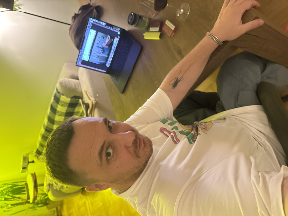 The image depicts a male subject seated at a wooden table in an indoor residential setting in Boreti, Montenegro. The male, with short brown hair and a beard, is wearing a white t-shirt with a multi-colored graphic design, and light blue trousers. He has a silver hoop earring in his left ear and a silver-colored bracelet on his right wrist. A black, abstract tattoo is visible on his right forearm. He is looking directly at the camera, which is held by him or a very close subject, adopting a selfie-like perspective. On the wooden table to the subject's right, a dark-colored laptop is open, displaying what appears to be a video stream, possibly surveillance footage, with multiple UI elements visible on the screen. Adjacent to the laptop are a clear glass containing red liquid (likely wine), a dark green jar, a yellow disposable vape pen, and two red packs of cigarettes. In the background, behind the table, a light-colored sofa with a black and yellow plaid blanket is visible. A large potted plant is situated to the far left. The ambient lighting in the room has a distinct yellowish-green tint. The floor appears to be light-colored parquet. No other individuals are present in the observable scene.