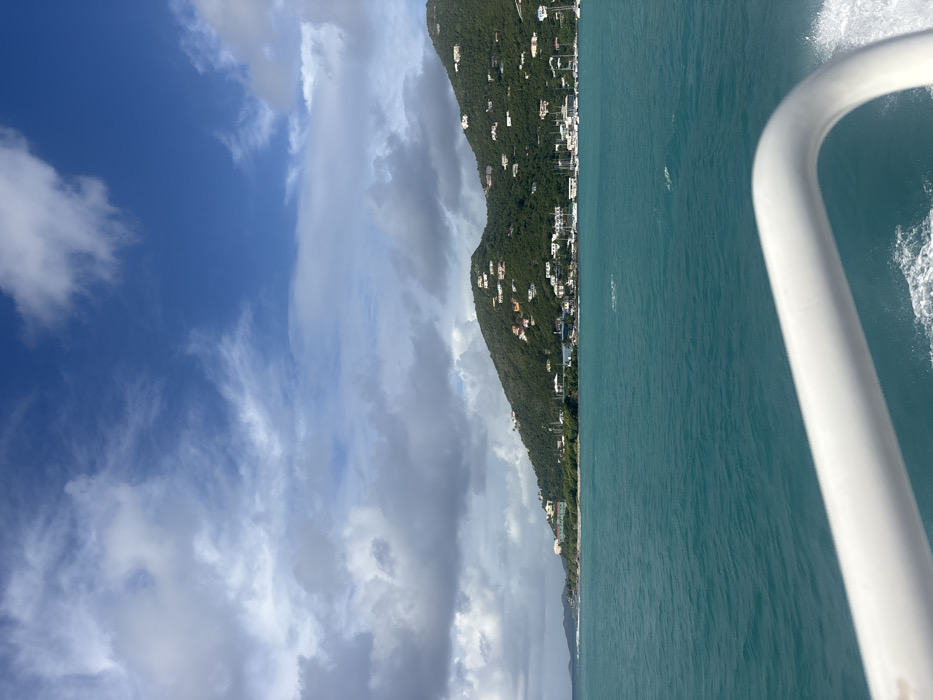 The image presents a wide-angle view of Road Town, Tortola, British Virgin Islands, observed from a low vantage point on a moving body of water