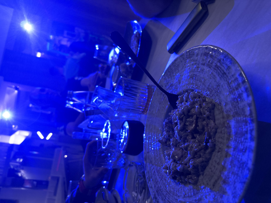 An indoor dining or lounge setting is depicted, illuminated predominantly by intense blue light. In the foreground, a textured ceramic plate contains a creamy, granular dish, consistent with risotto, with a black fork partially submerged. To the right of the plate, a gold-colored, elongated object resembling a vape pen rests on a light-colored table surface. An ashtray containing cigarette remnants is visible to the left, beside a clear glass holding a dark beverage, and multiple other clear drinking glasses, some empty. Two clear bottles are positioned on the table further back. A human hand is partially visible near the glasses on the left side of the frame. Indistinct figures of individuals are seated at tables in the blurred background, silhouetted against bright blue light sources, indicating a social gathering. This establishment is located in the city of Veliko Tarnovo, Bulgaria.