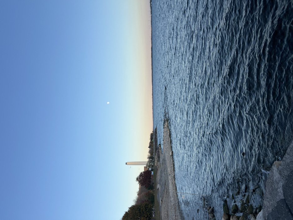 The image displays a waterfront scene in Kingston, Ontario, Canada, viewed across Lake Ontario from the northern shore, likely from the vicinity of Lake Ontario Park. The time of day is late afternoon or early evening, characterized by a clear blue sky that graduates to a lighter, warmer hue near the horizon. A distinct crescent moon is visible in the upper right quadrant of the sky. The foreground on the left consists of dark grey boulders and rocks along the immediate shoreline, with a partially submerged metallic mesh structure visible at the water's edge. The water, which occupies the majority of the lower and right frame, is dark blue with visible ripples and small waves. Further along the left shoreline, a gravel beach transitions into a grassy area featuring deciduous trees with visible autumnal foliage (reddish-browns and oranges). A prominent, tall, slender, white cylindrical smokestack, identifiable as belonging to Kingston General Hospital, stands on the land in the left-center. Several small, dark, indistinct shapes, possibly birds, are in the sky near the smokestack. The distant horizon across the water on the right reveals a low-lying landmass with faint structures, potentially wind turbines, visible. No human individuals or specific activities are depicted.