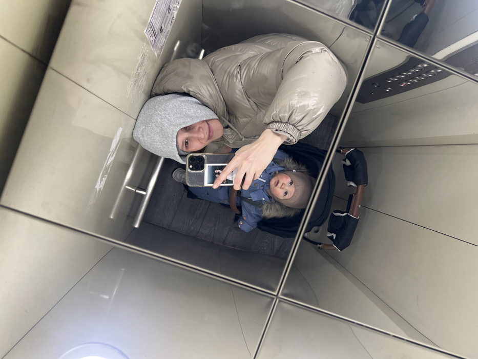 The scene depicts an elevator interior in Dolgoprudny, Russia, characterized by highly reflective, multi-paneled metallic walls that create fragmented mirror reflections. An adult female is positioned in the upper right reflection, facing the camera. She wears a light grey hooded garment beneath a shiny beige or taupe puffer jacket. Her left hand holds a dark-colored smartphone, featuring a prominent triple-lens camera module and a small, rectangular photograph attached to its rear case, towards the mirror to capture the image. A slight smile is visible on her face. To the lower left of the adult female, an infant is situated within a black stroller, which has brown handles with black grips. The infant wears a blue jacket with a fur-lined hood and a light brown beanie, looking directly towards the camera's position. Reflected within the elevator panels are additional details: a circular light fixture in the upper left, a metallic handrail in the upper right, and a control panel with multiple silver buttons featuring illuminated red indicators in the lower right. A white sign with Cyrillic text, likely detailing technical specifications or instructions, is partially visible in a reflection on the upper right panel. The elevator floor is dark and appears to have a textured surface.