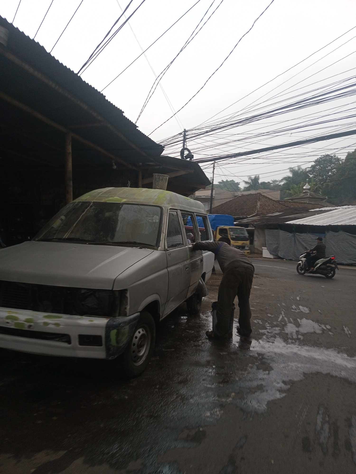 The image depicts a street scene in the city of Kan Beit, Myanmar, under an overcast sky traversed by numerous overhead utility wires. In the left foreground, a light-colored van, appearing to be an older model, is stationary beside an open-sided workshop featuring a corrugated metal roof and wooden support beams. The van's front bumper is absent, and green-yellow patches, consistent with body filler or primer, are visible on its roof and front fascia. A male subject, clad in dark work clothing, is bent over the driver's side of the van, performing an action involving water, as indicated by a dark bucket near his feet and wet ground with white foamy residue. On the paved street in the mid-ground right, a male subject in a dark cap operates a white scooter, moving away from the viewer. A yellow pickup truck is partially visible beyond the worker. The background contains various buildings with corrugated and tiled roofs, including one structure with a small dome, interspersed with trees.