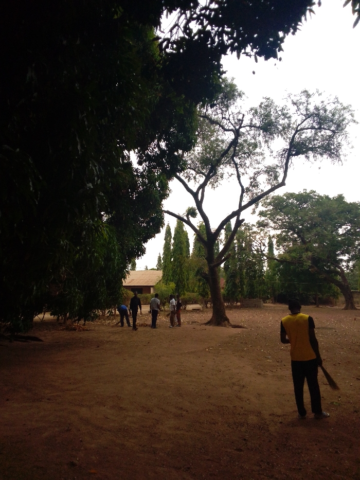 The image depicts an outdoor scene in Saminaka, Nigeria, characterized by a reddish-brown dirt ground with sparse leaf litter
