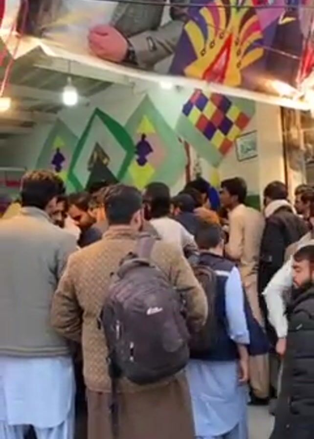 A crowd of men are gathered in a narrow street in front of a kite shop. Many of the men are wearing traditional Pakistani clothing. The shop is adorned with colorful kites, some of which have geometric patterns, others bear the image of a man. A man carries a stack of colorful kites, including a pink kite with black circles and gold centers, and a blue kite. The kites are displayed against a dark, weathered wall. Electrical wires are visible along the upper part of the scene.