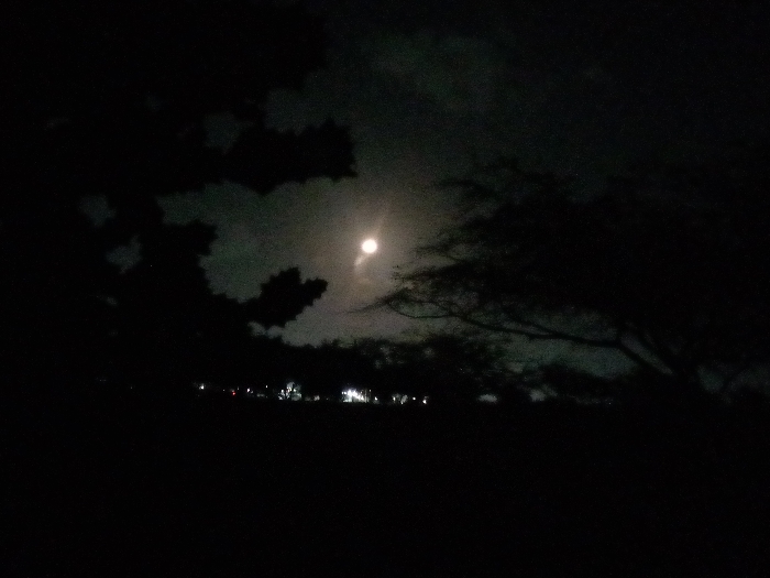 A night scene with a visible moon obscured by clouds, casting a dim glow