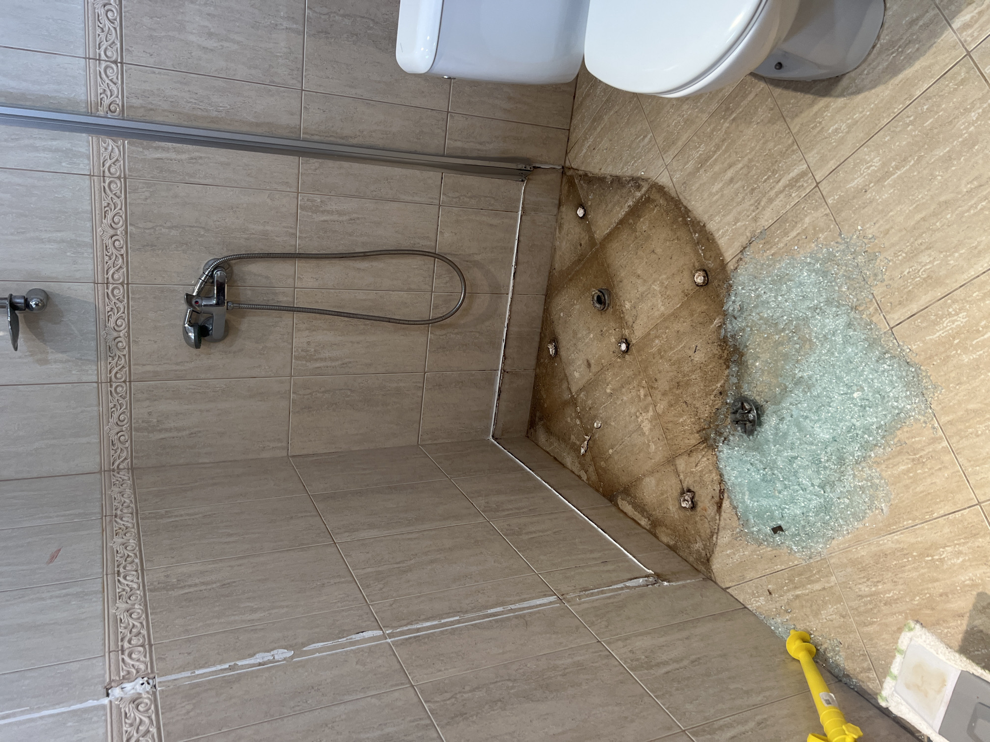 The image depicts a bathroom in disarray. A shower stall's glass enclosure has shattered, leaving a pile of broken glass on the tile floor adjacent to the shower base. The shower base is exposed, revealing the mounting points of the shower enclosure. A toilet is positioned near the shower. A shower head and faucet are visible on the wall of the shower. A yellow-handled cleaning tool and mop are partially visible in the corner. The location is Byala, Bulgaria.
