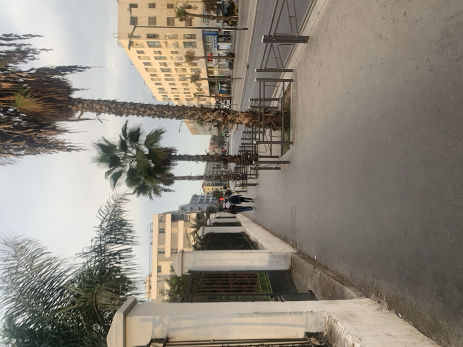 The image depicts an urban street scene in Casablanca, Morocco, viewed from a pedestrian sidewalk