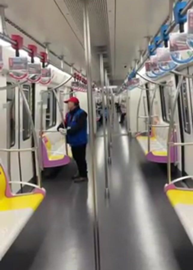interior of a subway car. The car is mostly empty with white walls and a gray floor. There are yellow and purple seats on either side of the aisle. Stainless steel poles run vertically down the center of the car for passengers to hold. A man in a red hat and blue vest is standing near one of the sets of seats, holding an object in his hand. Other passengers can be seen in the distance.