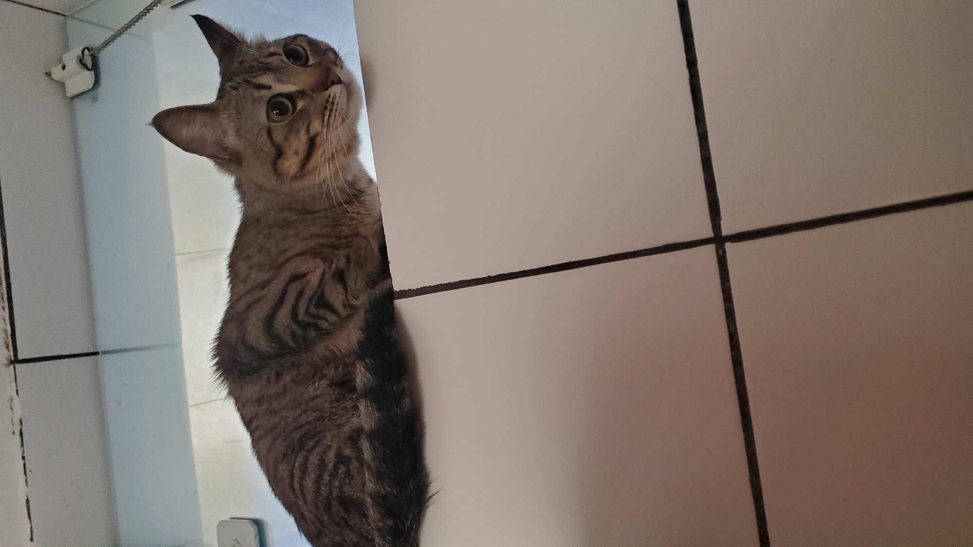A brown tabby cat is positioned partially obscured by a white wall. The cat is looking upward and to its left. The background shows white wall tiles with dark grout. The scene appears to be indoors. I cannot determine if the location is in Curitiba, Brazil.