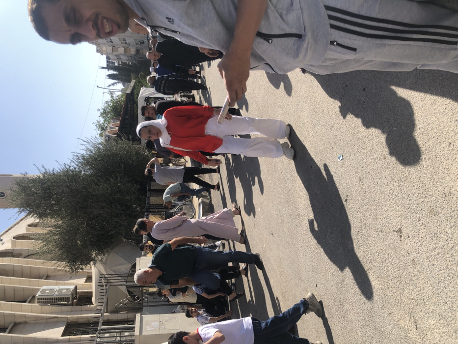 The image depicts a crowded urban street scene in Kafr Sousa Municipality, Syria, under bright daylight. In the foreground right, a man in a grey tracksuit with black stripes holds a white rectangular object, appearing to be a smartphone, and displays a grimacing expression towards the viewer. To his left, a woman wearing a white hijab, a red long-sleeved shirt, and white wide-leg pants walks forward, looking towards her left. Further left, a man in a dark green polo shirt and blue jeans is captured mid-stride, looking towards the left side of the frame. Multiple other pedestrians of varying ages and attire, including individuals in traditional light-colored thobes and a child in a white t-shirt and blue pants, populate the asphalt street. Long, distinct shadows are cast on the street surface by the individuals, indicating a clear, sunny day. In the background, a prominent building with a light-colored facade, featuring arched windows and a clock tower, is visible, suggesting a mosque or public institution. Adjacent to this building are air conditioning units and a large olive tree. A white tent-like structure or stall is situated in the mid-background right, and a bicycle is parked near a curb further back. The scene portrays a busy public thoroughfare.
