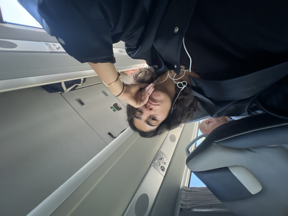 The image depicts the interior of a passenger transport vehicle, likely a bus or train, situated in the city of Pombal, Portugal. A young woman with dark, wavy hair is the primary subject, positioned at a low angle and looking directly at the camera. Her right hand rests against her cheek, and she wears a dark top, a dark jacket, a gold-beaded bracelet, and a thin black wristband. White wired headphones are draped around her neck. Behind her, partially visible to the left, is the bald head of another male passenger. The vehicle interior features upholstered seats in dark and light gray, light-colored overhead panels with air vents and reading lights, and a window on the left with drawn dark gray curtains, revealing bright daylight outside. An overhead storage compartment on the right contains a blue and white striped object.
