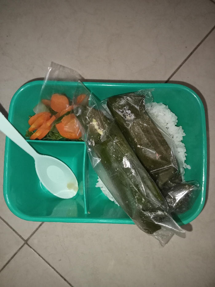 A turquoise bento box is divided into three compartments. One compartment contains carrot and greens salad in a plastic bag. Another section holds white rice, topped with two wrapped, elongated food items, also sealed in plastic. A light blue spoon rests in the third compartment. The container is on a neutral-toned tiled surface.