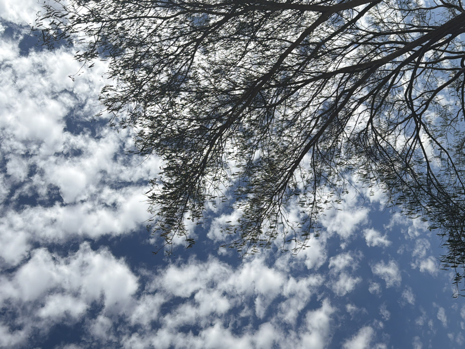 The image displays an outdoor scene in the Eshkol Regional Council, Israel, featuring a tree set against a cloudy sky. The upper left and central portions of the frame are occupied by a clear blue sky interspersed with numerous distinct, white cumulus clouds of varying sizes and shapes. The right half and lower right quadrant of the image are filled by the silhouetted branches of a deciduous or semi-deciduous tree. The tree's dark branches extend upward and across the frame, appearing backlit against the brighter sky. Small, elongated, dark structures, possibly seed pods or sparse foliage, are visible hanging from the branches. No people or artificial structures are present. The scene is illuminated by natural daylight.
