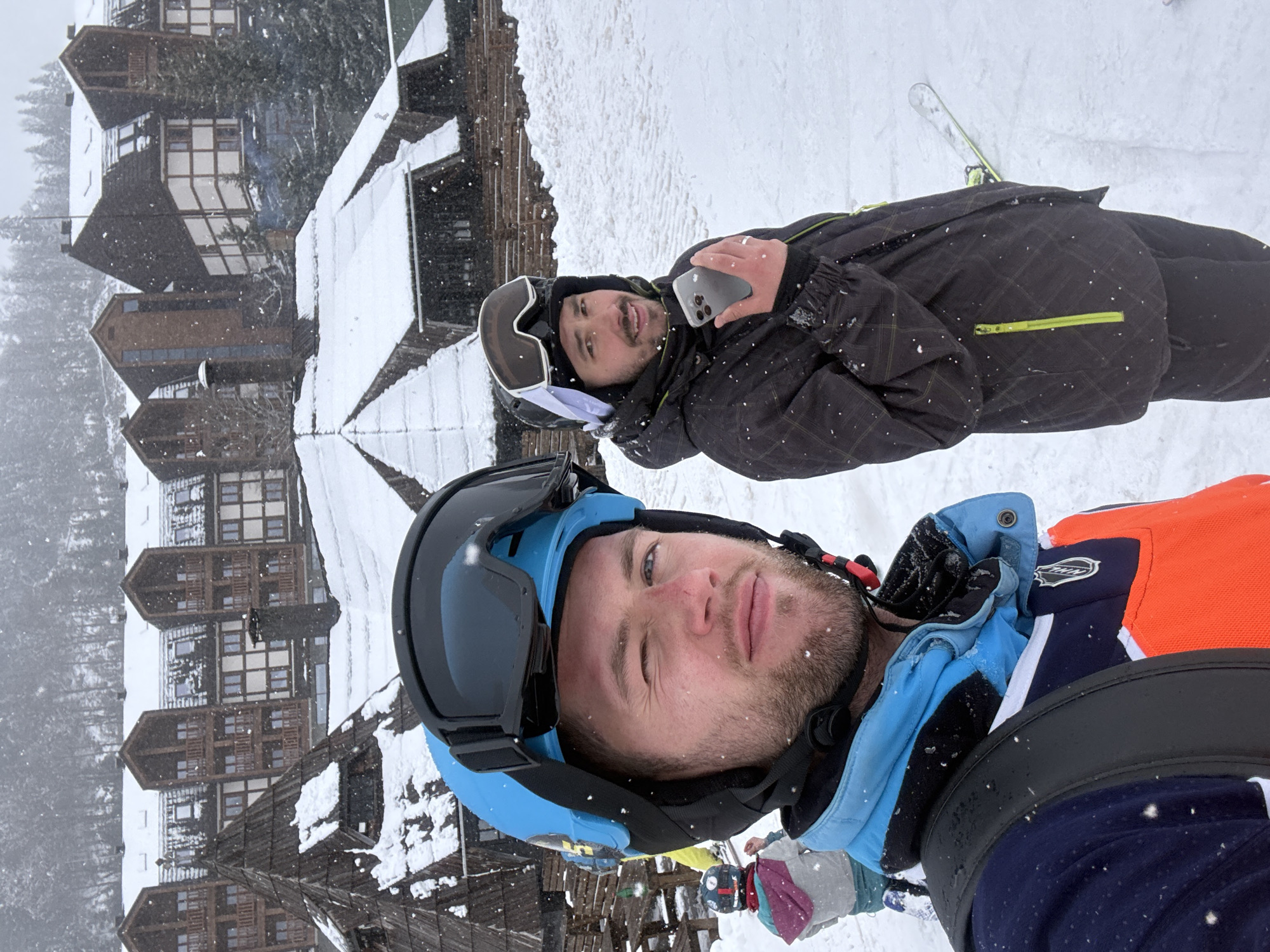 The image depicts a snowy outdoor scene at the Kolašin 1600 ski resort in Kolašin, Montenegro, during active light snowfall. In the foreground, a male subject is taking a selfie. He wears a bright blue ski helmet with black goggles pushed up, a blue and black layered jacket over a dark blue, white, and orange NHL-branded top, and a black backpack strap over his right shoulder. He has a light beard and is winking at the camera; snowflakes are visible on his face and clothing. To his right, a second male subject stands, facing the camera with a slight smile. He wears a dark plaid ski jacket with neon yellow zipper accents, a black beanie with white fabric draped from under his ski goggles, which are pushed up onto his forehead. He has a beard and mustache and is holding a grey smartphone in his right hand. Skis with yellow-green bindings are partially visible on the snow behind him. In the mid-ground, to the left of the foreground subject, a smaller individual is visible from behind, wearing a helmet with red accents, a grey and purple/teal jacket, and standing on skis in the snow. This individual is positioned near a rustic wooden structure with a pyramid-shaped, snow-covered roof. The background consists of several large, multi-story chalet-style buildings featuring prominent wooden and white paneled facades, multiple windows, balconies, and steep, snow-covered roofs with dormers. These structures are partially obscured by falling snow and are situated against a snow-covered forested hillside in the distance. The ground throughout the scene is covered in white snow.