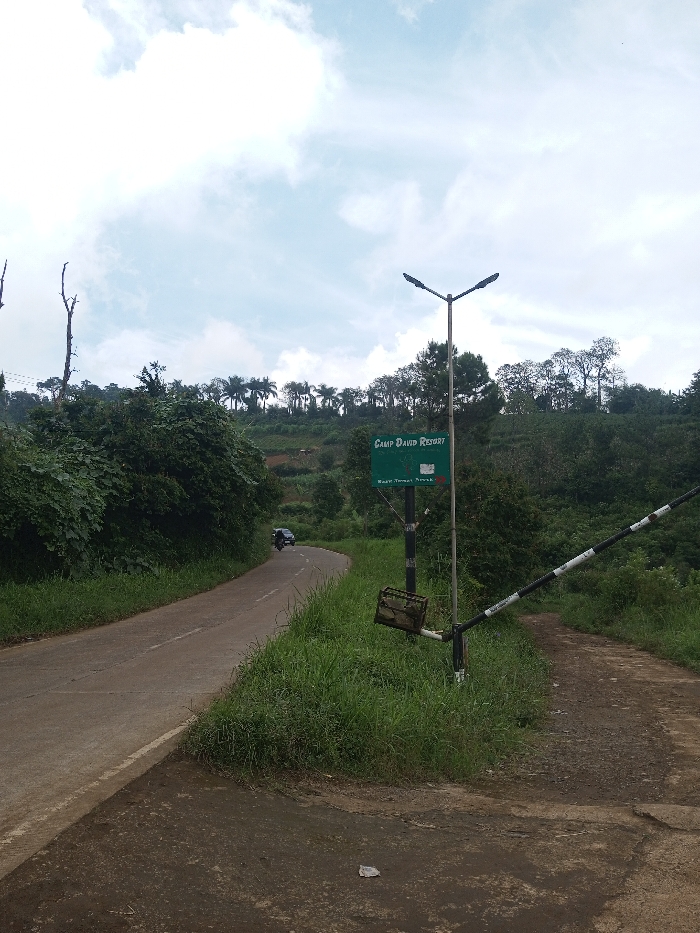 The image captures an outdoor scene at a road intersection in Vieng Phouka, Laos, under an overcast sky. A two-lane paved asphalt road curves left and ascends into the background on the left side of the frame, marked with a broken white center line and a solid white edge line. To the right of the paved road, a dirt path diverges downwards from the foreground. The immediate foreground consists of dark, disturbed earth and sparse weeds. A dark pole stands on the right side, between the paved road and the dirt path. Mounted on this pole is a green rectangular sign with white text reading "CAMP DAVID RESORT." Below this, additional smaller white text is present, largely illegible. Atop the pole is a dark, bifurcated streetlight fixture. A black and white striped barrier arm extends diagonally downwards to the right from the pole, blocking the dirt path. A small, open-weave rectangular metal basket or cage is also attached to the pole, positioned between the sign and the barrier arm's pivot point. Dense green vegetation, including bushes and trees, lines the left side of the paved road and covers the surrounding hilly terrain in the midground and background. In the middle ground, on the ascending paved road, a dark-colored motorcycle or scooter with at least one visible rider is observed. Distant hills show patches of trees, some appearing palm-like, against a sky filled with white and light grey clouds. Bare tree trunks are visible against the sky on the far left horizon.