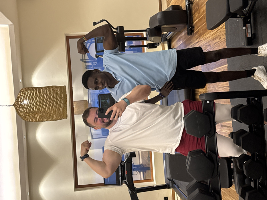 Two men pose flexing biceps in a gym mirror selfie. The man in front, fair-skinned, wears a white t-shirt and red shorts, holding a phone. Behind him, a dark-skinned man wears a light blue polo shirt and black shorts. Gym equipment is visible, including an elliptical machine and a weight rack. A straw pendant light hangs from the ceiling on the left side. A framed picture is displayed on the wall in the mirror.