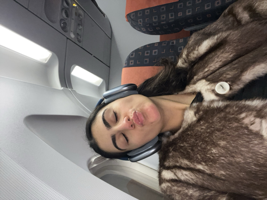 A woman rests in an airplane seat with her eyes closed and lips pursed. She wears large, over-ear headphones and is draped in a fur coat with a large, white button. The interior of the plane is visible, including the window and seat pattern. The image is rotated clockwise, making the woman appear to be lying on her side.