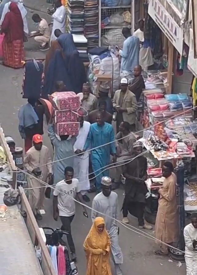crowded street market in what appears to be a predominantly Muslim area. Many people are walking along the street. Many of the men are wearing traditional Muslim attire, including white robes and kufis. Some women wear traditional Muslim clothing, including hijabs. Many vendors have set up stalls lining both sides of the street, displaying various merchandise, including clothes, fabrics, and goods packaged in boxes. One man is carrying a stack of packaged goods on his head as he walks through the crowd. The scene appears to be recorded from an elevated position.
