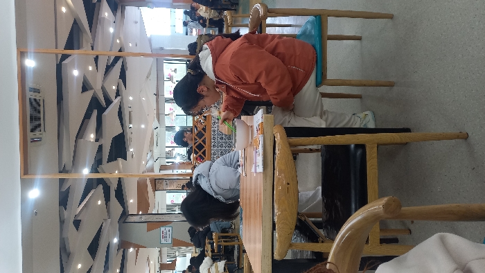 A cafeteria scene with students at tables. A young woman in an orange jacket stands hunched over a menu, examining it with chopsticks in hand. Other students are seated at adjacent tables. The room has a modern design, with angular white panels covering the ceiling, and windows allowing in natural light. The furniture includes wooden chairs, with black cushions.
