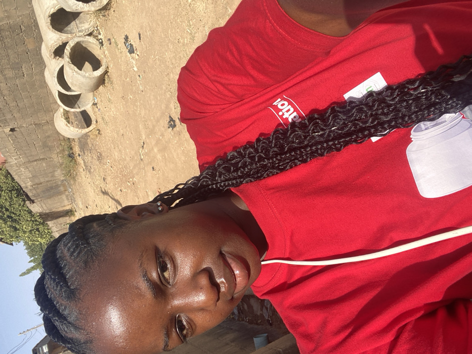 A young female, of dark complexion and with black braided cornrows, poses for a photograph. She wears a red short-sleeved t-shirt with a partial white logo displaying "nation" and a white graphic of a bottle or container. A white cable, likely for earphones, runs vertically down the front of her shirt. A silver stud earring is visible in her right ear. Her expression is neutral, with a slight upturn at the corners of her mouth. The scene is an outdoor, unpaved area in Sabon Tasha, Nigeria. The ground is dry, light brown soil. In the background to the left, a light-colored concrete or brick wall is visible, topped by green foliage. To the right, several large, grey concrete drainage or construction pipes are stacked horizontally on the ground. The lighting indicates bright daylight. No other individuals or direct interactions are visible.