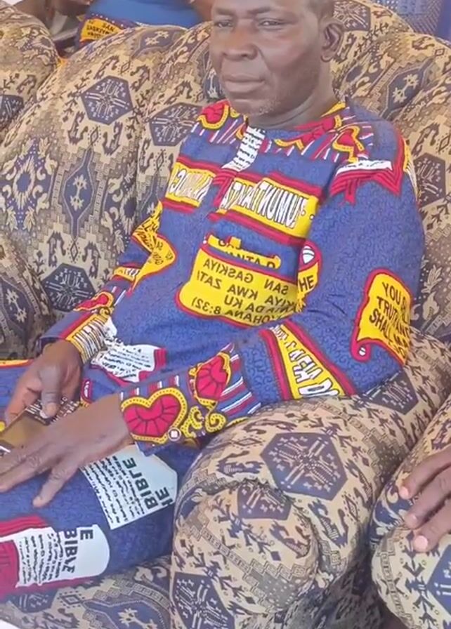 A medium shot shows an older man sitting on a cushioned chair wearing a brightly colored blue and yellow top with bible verses printed on it. He has a serious expression. The chair has a brown patterned fabric. To his right, another person in a blue suit is also sitting. In the background, other people are seated. The scene is outdoors. Music plays loudly in the background. The video ends with a partial view of the seated people.