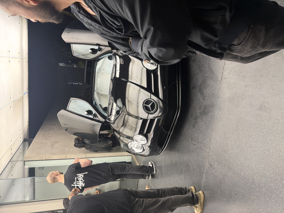 A black Mercedes-Benz SLR McLaren with gullwing doors stands in a bright showroom. Several people surround the vehicle. One person in a black Stüssy t-shirt looks at the car. Another person in a black jacket stands near the front. The car reflects the bright overhead lights. The setting suggests a car dealership or an automotive event.