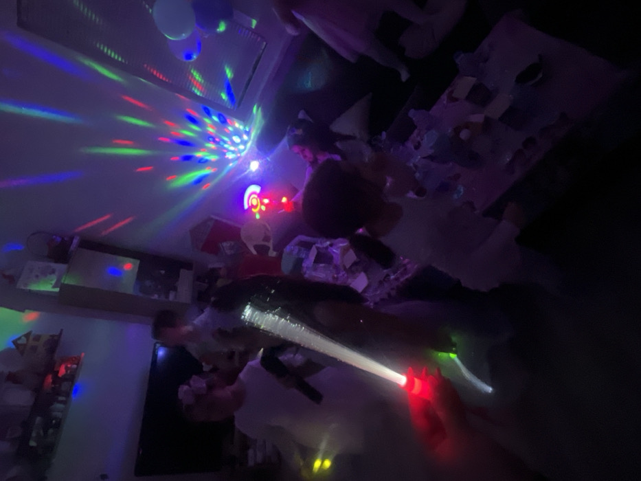 The image displays an indoor scene, likely a residential living space, in Plovdiv, Bulgaria, characterized by a darkened environment illuminated by artificial, multi-colored lighting. The primary light source, positioned out of frame but projecting from the upper right, casts distinct red, green, and blue light beams across the walls and ceiling, indicative of a disco-style light effect. Multiple individuals, predominantly children, are present and engaged in the scene. In the foreground, a person's left hand, adorned with painted fingernails, grips a light-up fiber optic wand. The wand emits a bright white light from its flexible fibers and a red glow from its base. To the left, a child in a light-colored garment with a bow in their hair holds a yellow glowing stick. A blurred figure stands behind this child. In the mid-ground to the right, a child with dark hair in a ponytail leans towards or interacts with a light-colored table. The table is laden with various small objects, possibly party supplies or refreshments. Another individual, partially visible on the far right, wears a light-colored top or dress. The surrounding environment includes a large, dark television screen mounted on the left wall, with shelves holding decorative items positioned above it. A cluster of light-colored balloons (specifically light blue and white) is visible in the upper right quadrant of the image. A dark sofa or cushioned seating is partially visible along the right side of the frame. The overall atmosphere suggests a celebratory event or party.