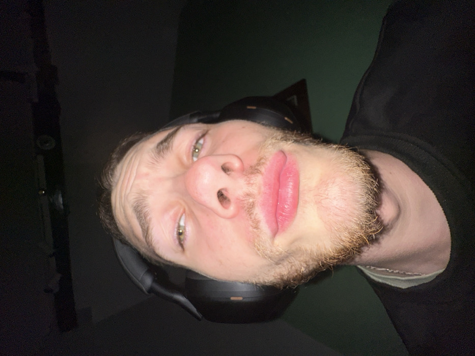 This image depicts a close-up, wide-angle selfie of a single male subject in an indoor, dimly lit environment. The subject, a male with light eyes, dark hair, and a light-brown beard, is wearing black over-ear headphones and a dark long-sleeved shirt. A silver-colored chain is visible around his neck. He is looking directly at the camera with a distorted facial expression, characterized by pursed lips and furrowed eyebrows. The background consists of a dark ceiling with indistinct objects, possibly a light fixture, and a dark wall, part of which appears dark green on the right side. The specific location within the city of Hà Nội, Vietnam, cannot be determined from the visual information provided.