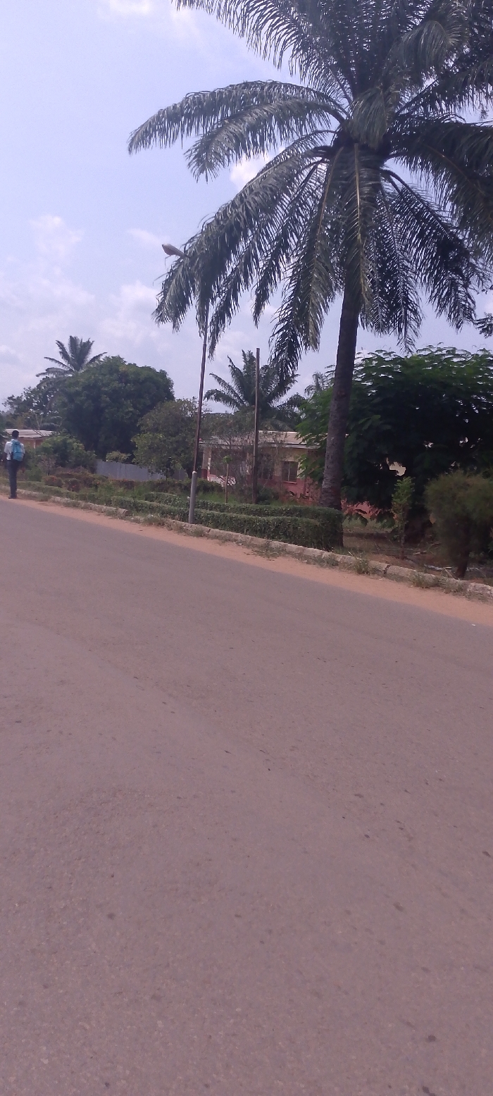 A paved, light brown-grey asphalt road extends diagonally from the lower right to the mid-left of the image under a light blue sky with scattered white clouds. To the right of the road, a concrete curb separates the pavement from a landscaped verge featuring trimmed green hedges. Behind these hedges, a dense array of tropical vegetation is visible, dominated by a large palm tree with dark green fronds on the right. Several other palm trees and deciduous trees are present further back. Partially visible among the foliage are two low-rise buildings, one with a reddish-pink exterior wall and a dark roof. Two slender utility poles are also visible in the mid-ground, one carrying a street light fixture. On the far left edge of the image, a lone individual, seen from behind, walks or stands on the dirt shoulder of the road. They are wearing dark trousers, a light-colored shirt, and a light blue backpack. The scene is consistent with a roadside environment within the city of Nsukka, Nigeria, likely near a residential or institutional area given the blend of landscaping and buildings.