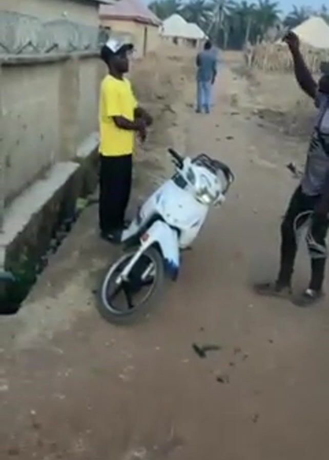 dirt road in what appears to be a rural village. In the first shot, a white scooter lies on its side, while two men stand nearby. One man wears a yellow shirt and black pants, and the other wears a gray shirt, black pants, and a cap, with what looks like cords wrapped around his legs. A third man walks away in the background. The second shot shows the man in the gray shirt walking by the scooter. The third shot shows two different men, one in a neon green shirt and red shorts, and the other in an orange robe. They appear to be talking. The setting includes simple buildings and scattered debris along the roadside.