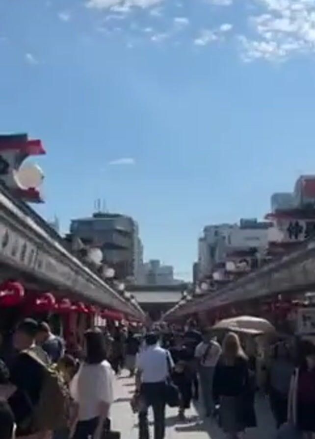 large crowd of people walking along a wide, paved street lined with shops. The shops are covered by an overhead structure decorated with red lanterns and white lights. The people are of various ages and ethnicities. Buildings rise in the background against a bright blue sky with scattered clouds.