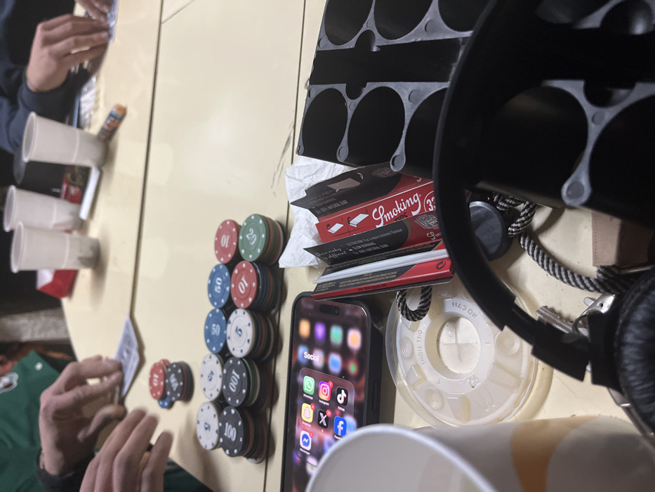 A table setup for a poker game in progress. Stacks of poker chips in various denominations ($10, $20, $50, and $100) are visible. Beside the chips, a smartphone displays a "Social" folder. Nearby are several boxes of "Smoking" brand cigarette rolling papers. A black headphone sits by a stack of plastic cups. In the foreground, someone's hands are holding cards, while in the background, a player's arm and additional cups are seen.