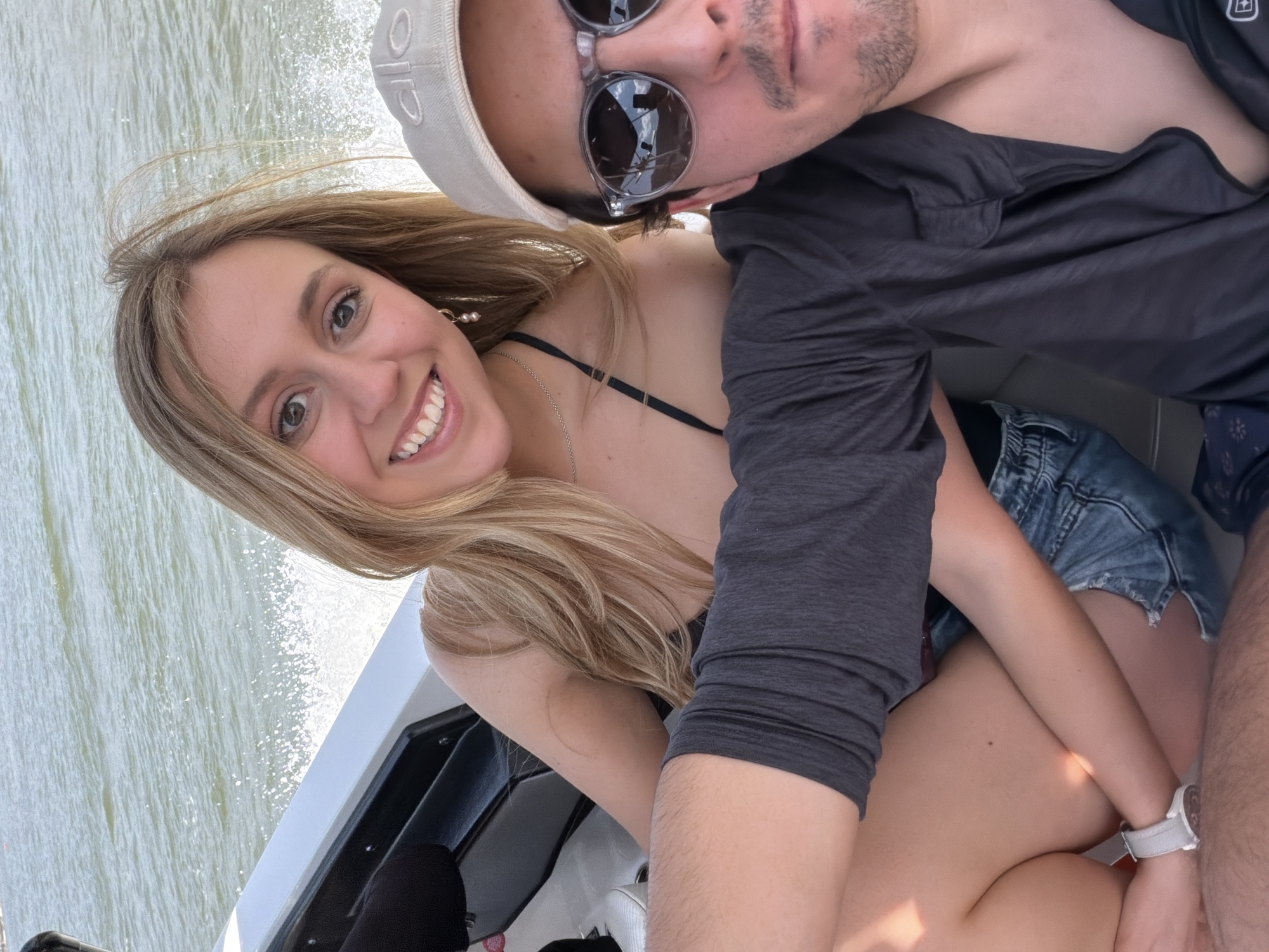 A young woman and man are closely positioned in a selfie-style image on a boat, possibly on Lake Avándaro. The woman is fair-skinned with long blonde hair, wearing a black bikini top, silver necklace, and a pearl earring. She is smiling towards the camera. The man is light-skinned with short dark hair, wearing sunglasses and a grey baseball cap. He is wearing a long-sleeved shirt. He appears to be holding the woman, possibly in an embrace, while taking the picture. The background shows water, likely a lake, with some white wake visible from the boat's movement. Parts of the white boat are visible in the foreground.