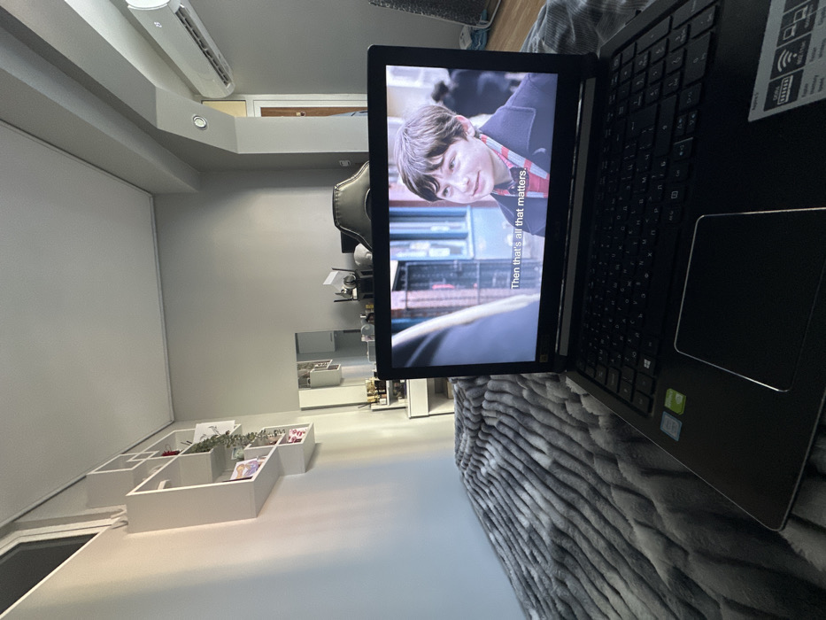 A black Acer laptop, featuring a Cyrillic keyboard and Intel Core i5 and NVIDIA GeForce stickers on the palm rest, is positioned on a grey, textured comforter, likely on a bed. The laptop screen displays a close-up image from a video, showing a young boy with dark brown hair, wearing a dark coat over a red and black plaid shirt, looking towards the left and exhibiting a faint smile. English subtitles reading "Then that's all that matters" are visible at the bottom of the screen. The background depicts an indoor residential room in Vidin, Bulgaria, with light grey walls and a white ceiling. On the left wall, a white, multi-compartment modular shelf unit holds small potted plants and other decorative items. Further back, against the rear wall, a white dressing table or desk is visible, adorned with various bottles and objects, and surmounted by a mirror. The mirror reflects a partial view of an adjacent space, possibly a kitchen, showing a white cabinet. A dark, high-backed office or gaming chair is partially visible behind the laptop. In the upper right portion of the image, a white split-system air conditioning unit is mounted on the wall near a doorway leading to another area of the dwelling. The room is illuminated by artificial ambient light.