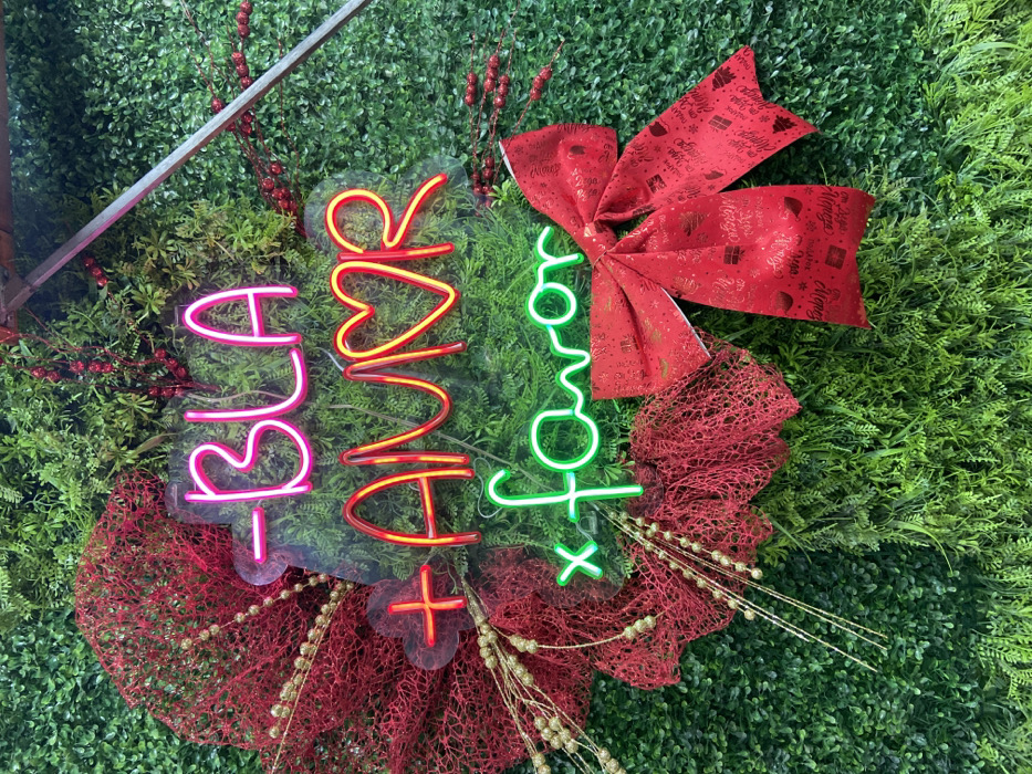 The scene presents a decorative wall display, consistent with an interior or exterior commercial setting in Maracay, Venezuela. The background consists of a dense, artificial green foliage wall. Centrally positioned are three illuminated neon signs mounted on clear acrylic backings. The top sign, in pink neon, spells "-BLA". Below it, a red-orange neon sign displays "+ AMOR", with a heart symbol replacing the 'O'. The bottom sign, in green neon, reads "x favor". To the left of the neon signs, a large, semi-circular arrangement of dark red, open-weave mesh fabric is present, interwoven with multiple strands of golden beaded garland. Scattered red berry sprigs are integrated into the foliage in the upper right area. A large red fabric bow, adorned with golden patterns depicting gift boxes, Christmas trees, and "Merry Christmas" text, is affixed to the lower right section of the display. A metallic silver structural bar is partially visible in the upper right corner, extending diagonally. No individuals are present in the image.