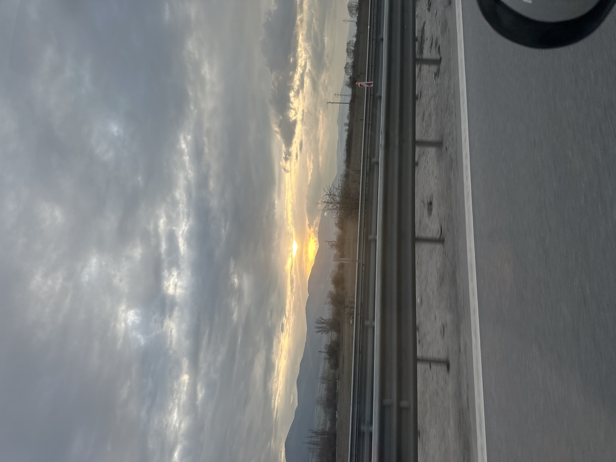 The image depicts a sunset view from a highway near Mirovo, Bulgaria. A mountain range is visible on the horizon, partially obscuring the setting sun. The sky is filled with gray and white clouds. A guardrail runs along the edge of the highway, and the asphalt road surface is visible in the foreground. A small roadside marker or sign is seen in the distance. A portion of a car's rear-view mirror is visible in the upper-right corner.