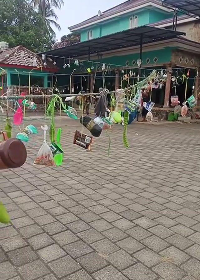 A vertical shot reveals a structure decorated with recycled materials. The structure appears to be made of poles with lines strung between them, from which various items are hanging. The items include plastic bottles, cups, bags, a sandal, and what appears to be an eggplant. The structure is located outside of a light green building with a dark roof. The ground is paved with grey bricks. Palm trees are visible in the background. A person walks into frame in the lower right. The scene appears to be outdoors on a sunny day. Music is playing in the background.