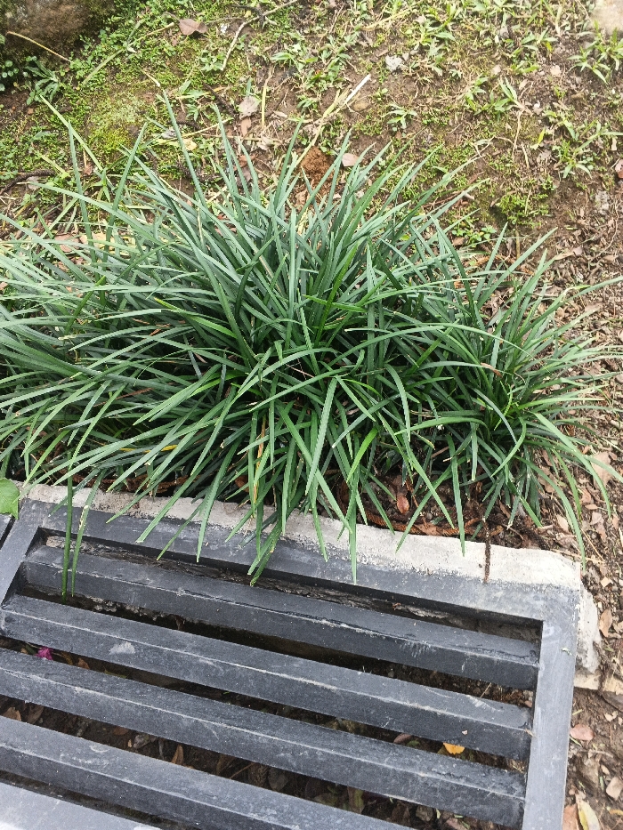 This image, captured in Munyati, Zimbabwe, presents a high-angle view of an outdoor scene. The primary subject is a dense clump of dark green, strap-leaved, grass-like plants, occupying the upper and central portions of the frame. Below the vegetation, a dark gray metal grate is visible, positioned parallel to the bottom edge of the image. This grate consists of multiple horizontal slats and is bordered by a light gray concrete frame. The plants slightly overhang the concrete border and extend towards the grate. The ground surrounding the plants in the upper section is composed of brown soil with scattered dry leaves and sparse, smaller green vegetation. No individuals or active interactions are depicted within the scene.