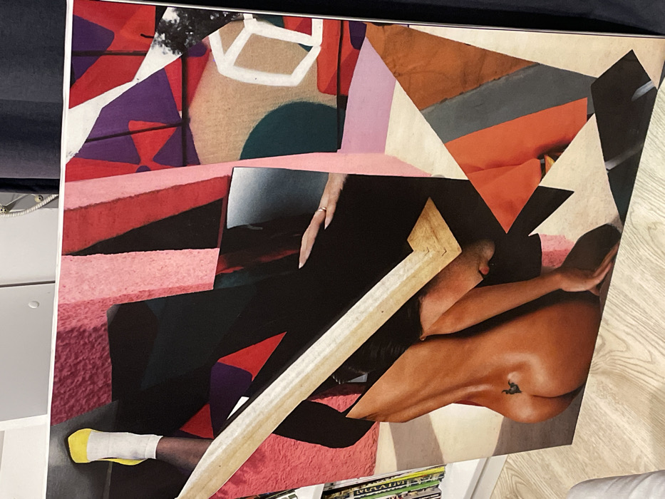 A large, vertically oriented framed artwork, appearing to be a collage or mixed-media piece, leans against a light-colored wall or cabinet, resting on a light wooden floor. The artwork features an abstract composition incorporating bold geometric shapes and textures in a color palette dominated by black, various shades of pink, red, purple, beige, teal, orange, and white. Within this composition, figurative elements are discernible: a dark-skinned lower leg and foot with a white sock and yellow accent is visible in the upper left quadrant; a light-skinned hand with manicured nails and a ring on the fourth finger appears in the mid-right; and a light-skinned individual's lower back and buttocks, displaying a small dark tattoo (resembling a stylized bull or similar animal) above the gluteal cleft, is positioned in the lower left. A distinct, light-colored wooden beam-like object with an angled end cuts diagonally across the central portion of the artwork. In the background, a white shelving unit or cabinet containing what appears to be magazines or books is visible to the left of the artwork, while a dark fabric curtain is partially visible to the right. The scene is located in the city of Sochi, Russia.