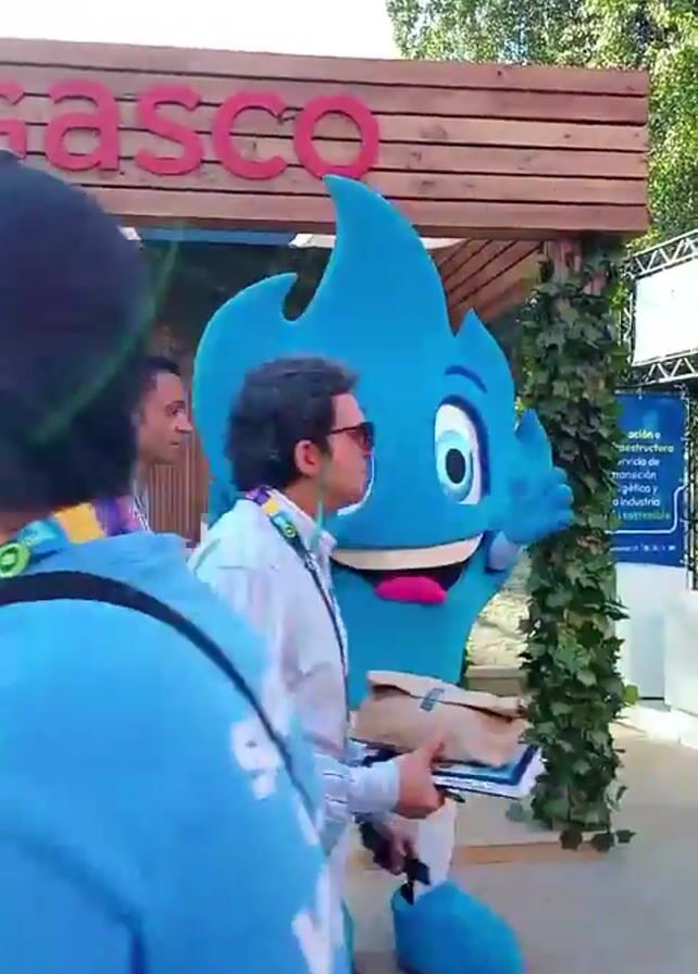 person in a blue mascot costume standing in front of a building with a sign that says "gasco". The mascot has a flame shape on its head and is wearing white leggings and blue shoes. The mascot is smiling and waving. People walk by the mascot. The background is a sunny day with trees. Another booth with "transelca" visible is in the background.