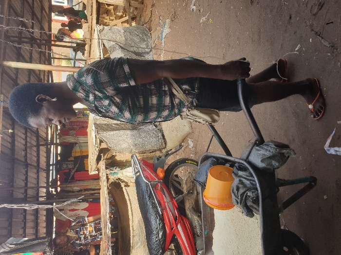 The image captures an outdoor market scene in Obosi, Nigeria. An adult female, with short dark hair and a single earring on her left ear, is depicted in profile, facing right. She is wearing a green, white, and dark plaid short-sleeved collared shirt, dark shorts, and orange-strapped flip-flops. A light-colored pouch is slung across her body, resting at her right hip. She is actively pushing a dark-colored metal wheelbarrow. The wheelbarrow's basin contains a volume of light-colored granular material, an orange plastic bucket, and a dark bundled item. Behind the wheelbarrow, a red motorcycle with a black seat cover is parked. The background reveals several market stalls constructed with wooden frameworks and corrugated metal roofs, displaying various hanging clothing items. A male individual in a patterned shirt is partially visible behind a stall on the left. Several indistinct figures are present in the distant background to the right. The ground is unpaved dirt with scattered light-colored debris.