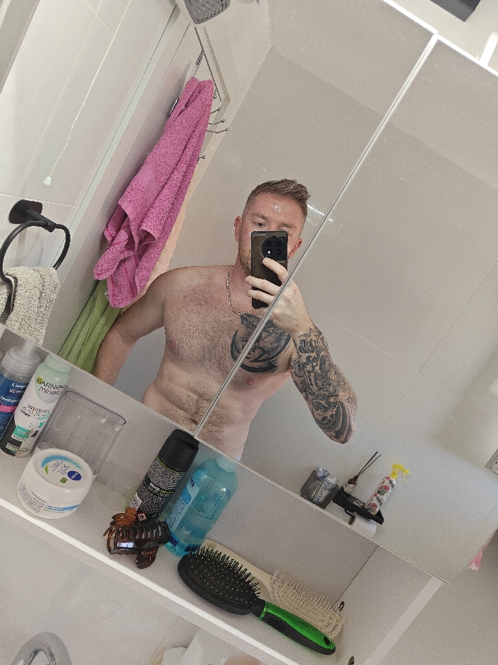 - "A shirtless man with an arm tattoo takes a mirror selfie in a bright bathroom" by FM-zE0mP2, licensed under CC BY 4.0
