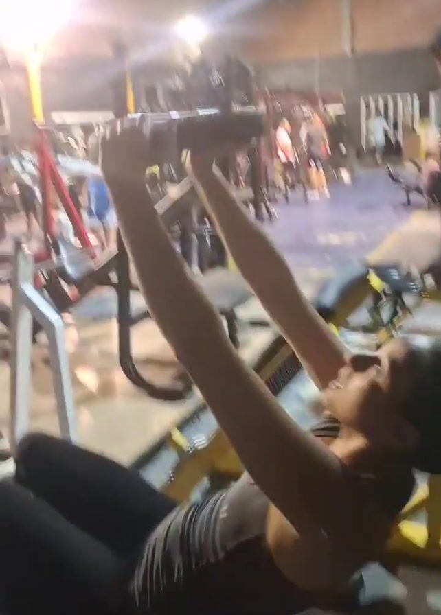 A woman wearing black leggings and a dark-colored tank top is performing crunches with a weight plate in a gym. She is lying on a decline bench with a red cushion. The gym has various weight machines and equipment, and other people are exercising in the background. The gym's lighting is bright, and the floor is a combination of blue and gray. Other gym benches and equipment are visible around her. A person walks behind her bench in the background.