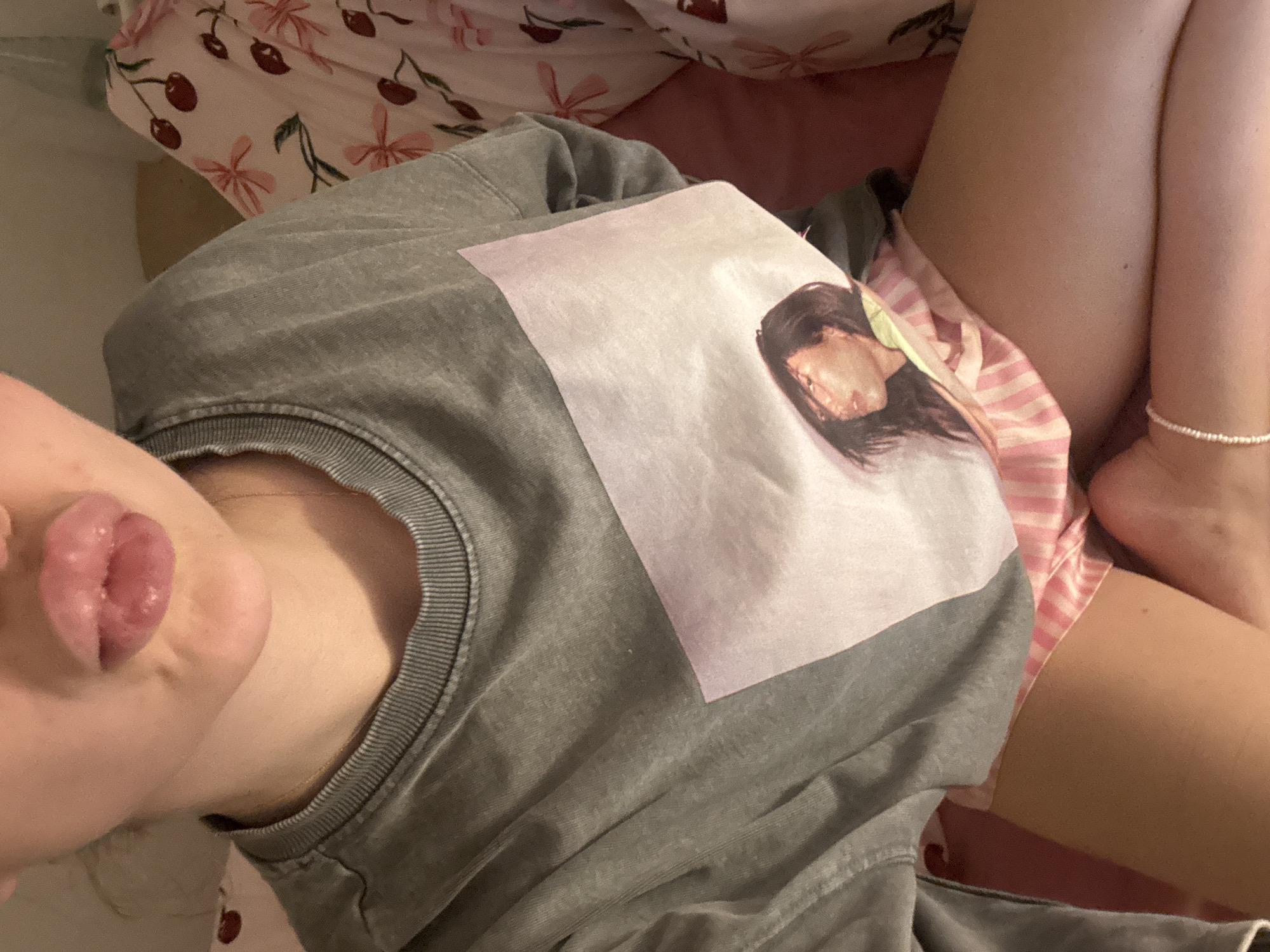 The image displays a close-up, downward-angled view of an individual in what appears to be a private indoor domestic setting. The subject's lower face is visible, featuring full, parted lips with the anterior tip of the tongue protruding slightly. A thin gold-colored chain necklace is present around the neck. The individual is wearing a grey, possibly faded, long-sleeved crewneck sweatshirt with a ribbed collar and cuffs. The front of the sweatshirt displays a rectangular graphic print depicting a woman's profile with dark hair, looking towards the left. Beneath the sweatshirt, pink and white vertically striped fabric is visible, consistent with shorts or underwear. The subject's thighs are exposed, and a white beaded bracelet is worn on the left wrist or forearm, resting on the left thigh. The background on the right side of the frame consists of bed linen patterned with dark red cherries and pink flowers on a light ground. The surface directly beneath the subject's lower body is a plain reddish-pink textile. Illumination within the scene is soft and warm. The specific location within L'hospitalet De Llobregat, Spain, cannot be determined from the visual information provided.