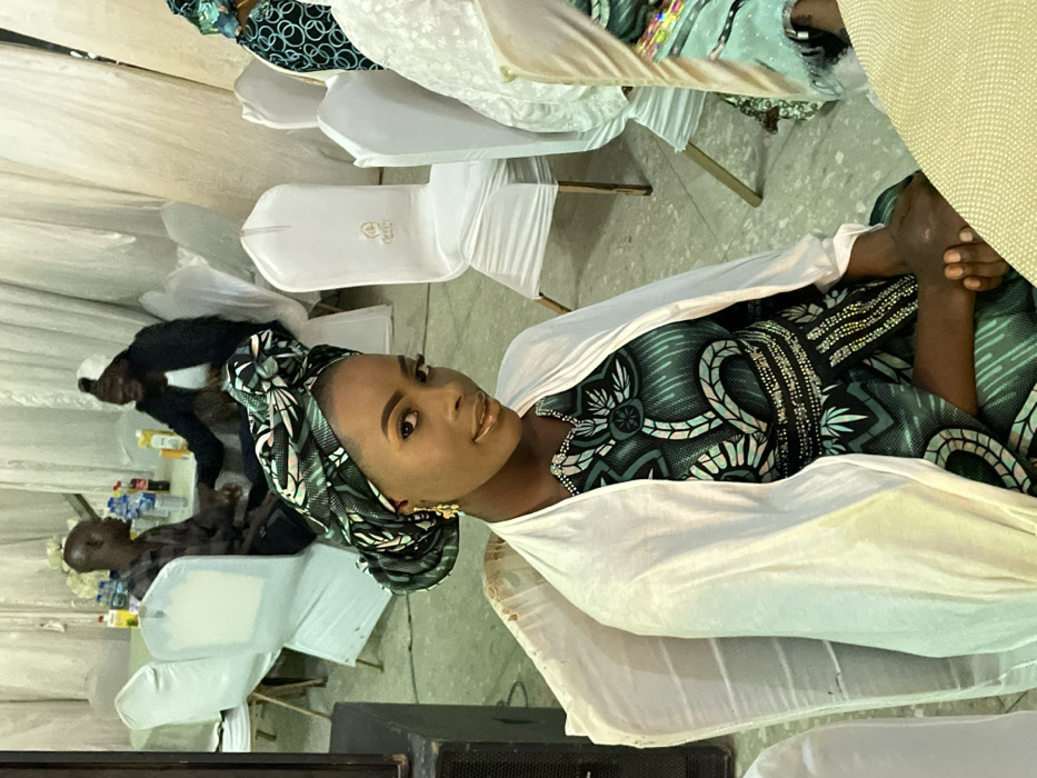 A woman in patterned green attire and a matching headwrap is seated, draped in a white shawl. She is turned towards the viewer, showcasing golden earrings. The backdrop reveals a room with white-covered chairs. Seated individuals and tables adorned with water bottles are visible in the background. A black speaker is in the foreground.