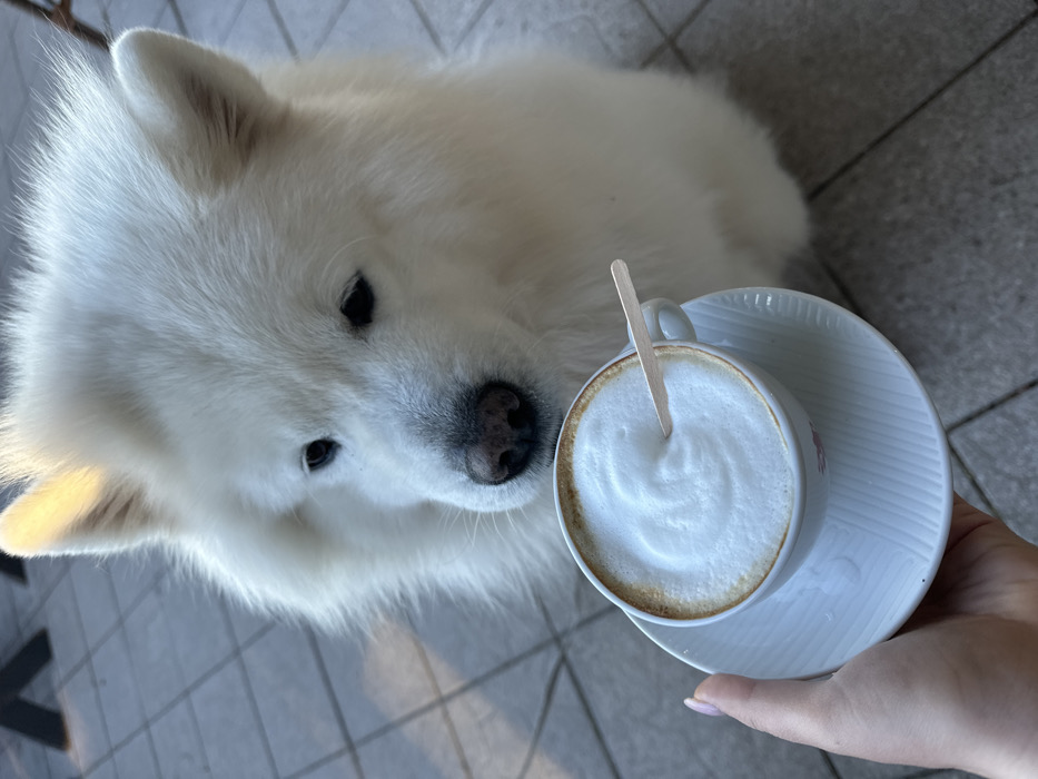 In the city of Bar, Montenegro, a white, fluffy dog, consistent with a Samoyed breed, is depicted in an outdoor setting. The dog is seated on a light grey tiled surface, its head slightly lowered, and its dark eyes focused on a white ceramic coffee cup. A human hand, showing visible fingernails, holds the cup and its matching white, ridged saucer directly in front of the dog. The cup contains a beverage topped with a thick layer of white foam, into which a thin, light-colored wooden stir stick is inserted. Natural light illuminates the scene, catching the top of the dog's right ear.