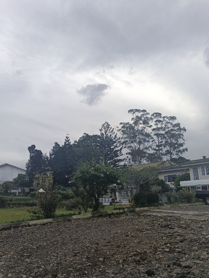 The image displays an outdoor scene in Kon Ra Kiah, Vietnam, under an overcast, light grey sky with scattered darker clouds. The foreground consists of an extensive, uneven surface of dark grey and brown gravel or small rocks. A low, light-colored concrete or stone curb delineates the gravel from a green grassy area in the midground. This grassy section features several dark green bushes and trees, one prominently displaying light-colored or pink blossoms. Yellow flowers are visible within the grass to the left. In the background, multiple buildings are visible amidst dense tree coverage. To the left, a white building with a dark, sloped roof is partially obscured by tall, dark green trees. To the right, a two-story building with light-colored walls and a dark, sloped roof features several windows. A dark-colored vehicle, possibly a utility truck, is parked adjacent to the right side of this building, partially visible. The background is dominated by numerous trees, including tall conifers and broader deciduous trees with varying shades of green foliage and some lighter-colored trunks. No individuals are present in the scene.