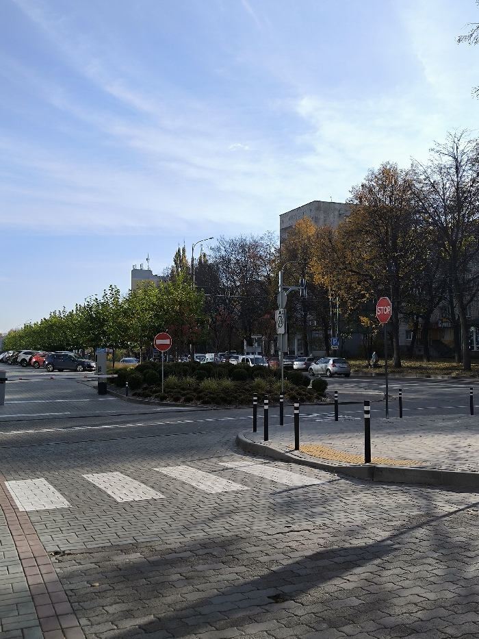 The image depicts an urban street intersection or roundabout in Rivne, Ukraine, under clear blue skies with sparse cirrus clouds. The foreground features a pedestrian crossing marked with white zebra stripes on light grey and darker grey patterned paving stones. A raised curb with yellow tactile paving delineates the sidewalk from the roadway. Multiple black and white striped bollards are positioned along the edge of a central island. Long shadows are cast across the paved surfaces, indicating natural sunlight. The midground includes a circular central island planted with dense green shrubs. Two prominent traffic signs are visible: a red circular "No Entry" sign with a white horizontal bar on the left side of the island, and a red octagonal "STOP" sign on the right side, facing the viewer. A pole with additional, indistinct traffic signs (including a blue square sign) stands near the center of the island. Multiple vehicles are visible: a line of cars (primarily white, silver, and dark grey) are parked or stopped on the left side of the road, and several cars (including a silver sedan and a white van) are present on the road segment to the right of the central island. A street lamp post is also visible. The background reveals a line of green-leafed trees on the left and a cluster of deciduous trees displaying autumn foliage (yellow and orange) on the right. Multi-story buildings are partially obscured by trees, with a large, light-colored rectangular building featuring dark windows prominent on the upper right side. A single, indistinct human figure is partially visible on the far right, positioned behind the STOP sign and trees on a grassy area. No discernible interaction or specific action is observed among people or between people and objects.