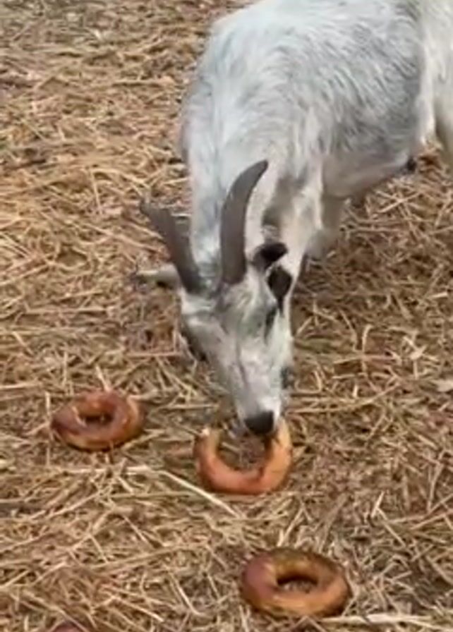 goat in a barnyard eating a bagel off of a straw-covered ground. Other goats, ducks, pigeons, and a chicken are also in the yard. The goat eats the bagel, then approaches another. After that, the camera pans to show all of the animals in the yard.